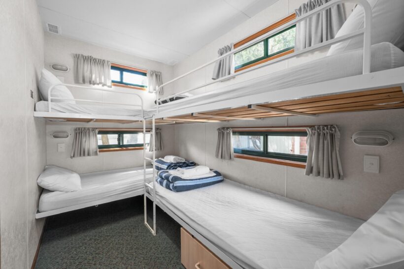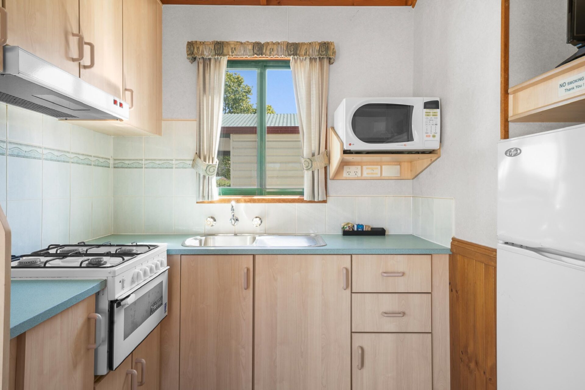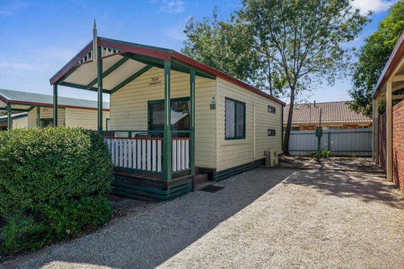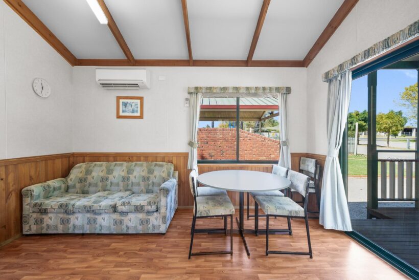 Perfect for families or groups, this spacious cabin sleeps up to six guests across two bedrooms with a queen bed in the main and two sets of bunk beds in the second. The air-conditioned living area includes a sofa, dining table, and TV. A well-equipped kitchenette features a large fridge, microwave, and stovetop grill for easy meal prep. Enjoy all the comforts of home just minutes from Albury’s attractions.